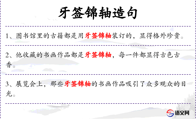 3. 【牙签锦轴】 - 卷型古书的标签和卷轴。借指书籍。形容书籍之精美。同“牙签玉轴”。
