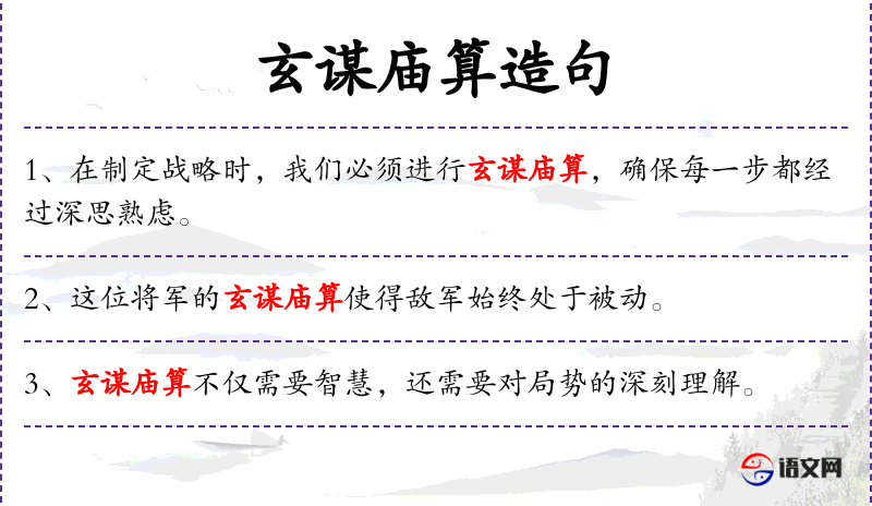 5. 【玄谋庙算】 玄谋:神妙的计策;庙算:庙堂上的筹划。指朝廷的重大决策和谋略。