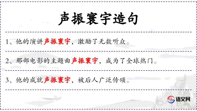 - 声振环宇:形容声音非常响亮,传遍全世界。