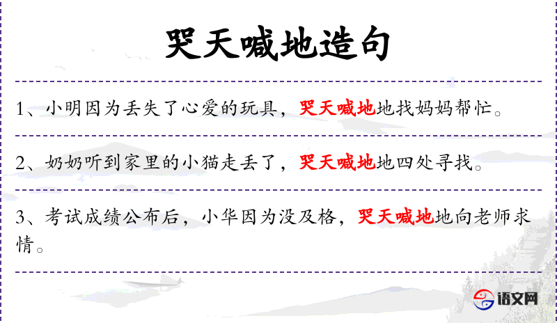 - 状语:因为错过了重要的比赛、哭天喊地地、没有早点出发