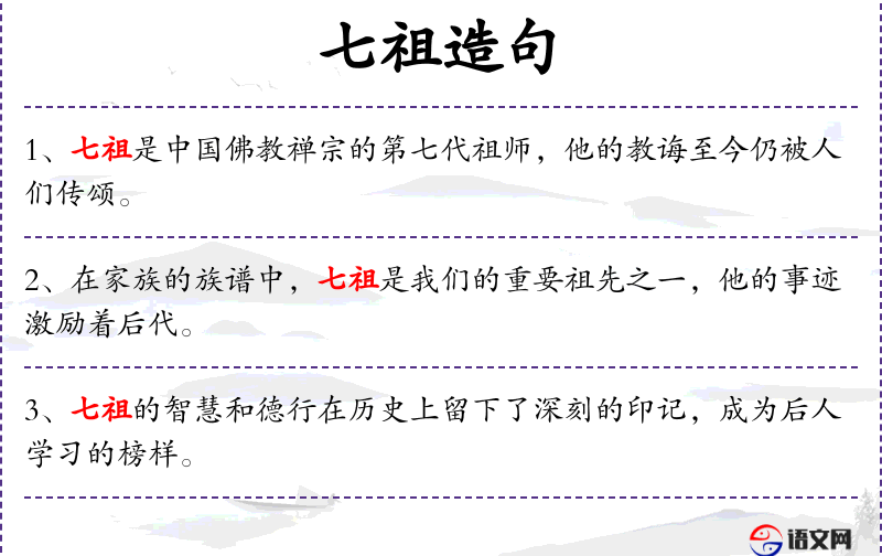 1. 【七祖】 七代祖先; 佛教称传法相承的七代。华严宗以马鸣﹑龙树﹑杜顺﹑智俨﹑法藏﹑澄观﹑宗密为七祖。禅宗南宗以达摩﹑慧可﹑僧璨﹑道信﹑弘忍﹑慧能﹑神会为七祖。禅宗北宗以弘忍的另一弟子神秀为六祖,普寂为七祖。