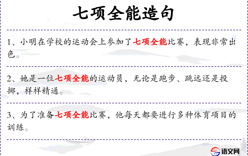 1. 【七项全能】 田径综合性比赛项目之一,运动员在两天内依次完成100米跨栏、跳高、铅球、200米跑、跳远、标枪、800米跑等七项比赛。