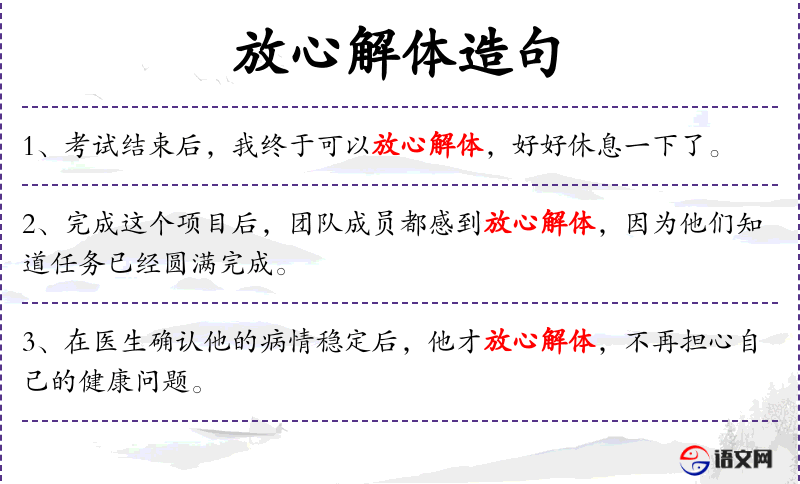 - 放心解体:“放心”表示安心,“解体”在这里比喻为放松或解脱。
