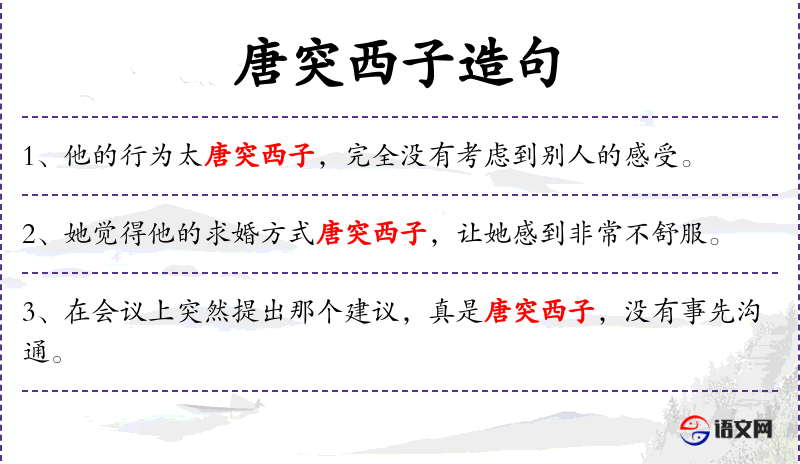 - 成语典故:“唐突西子”源自古代美女西施的典故,用来形容行为突然且出人意料。