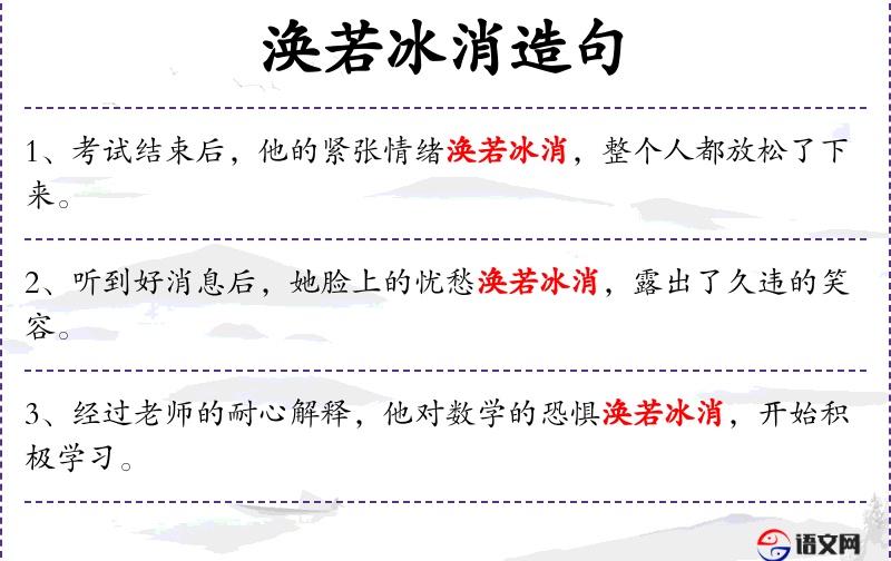 1. 【涣若冰消】 - 犹言涣然冰释。象冰遇热消融一般。形容疑虑、误会、隔阂等完全消除。