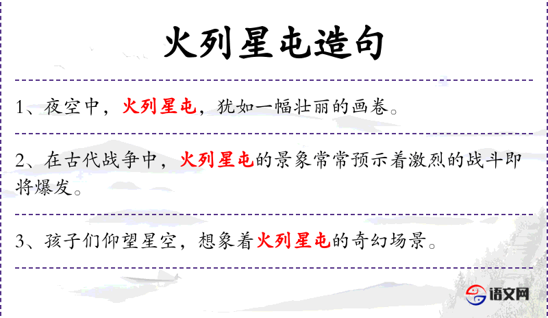 3. 【火列星屯】 - 火列:一列列火堆;星屯:星罗棋布的村庄,指驻扎下来的军队。形容军队阵势强大。