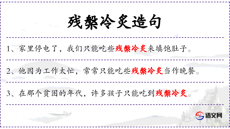 1. 【残槃冷炙】 - 冷炙:已经凉了的烤肉。指残剩的饭菜。也指权贵施舍的东西。