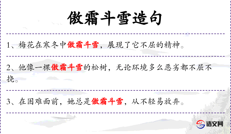 - 增强语言灵活性:她总是以傲霜斗雪的精神面对困难,从不轻易放弃。