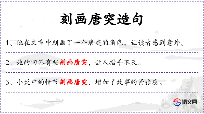 1. 【刻画唐突】 刻画:精细的描绘。比喻为了突出丑的而贬低了美的。