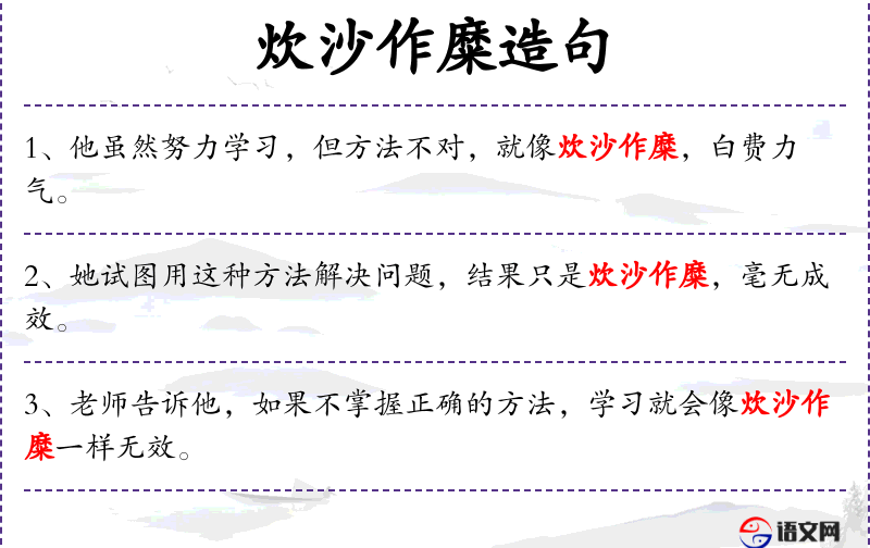 5. 【炊沙作糜】 - 煮沙子作饭。比喻徒劳无功,白费气力。