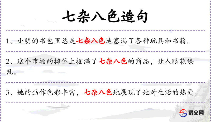 1. 【七杂八色】 - 形容品种与颜色纷杂多样。
