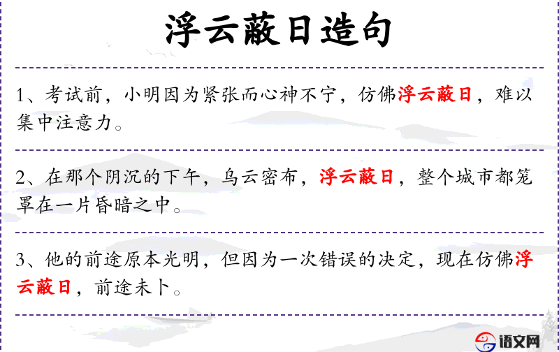 1. 【浮云蔽日】 - 浮云遮住太阳。原比喻奸佞之徒蒙蔽君主。后泛指小人当道,社会一片黑暗。