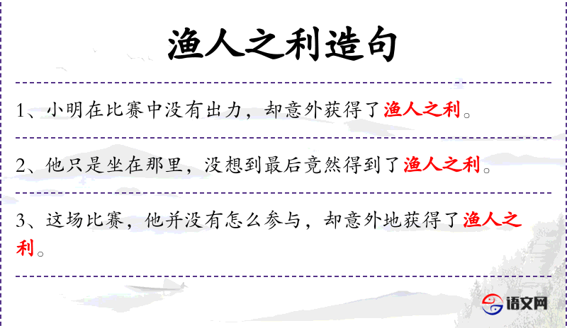 1. 【渔人之利】 - 渔人:比喻第三者。比喻双方争执不下,两败俱伤,让第三者占了便宜。