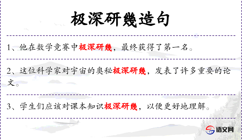 3. 【极深研幾】 研:研究,审查;幾:细微。形容钻研深刻、细致。