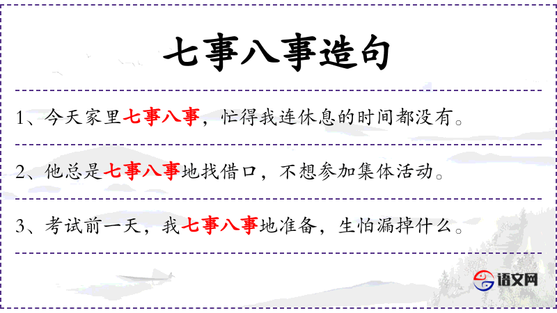 1. 【七事八事】 - 形容事情多而杂乱。