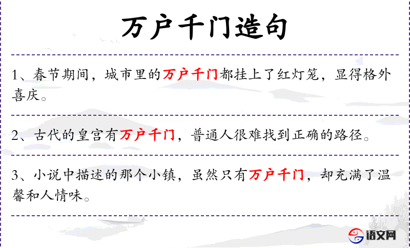 1. 【万户千门】 指众多人家。也形容屋宇深广。