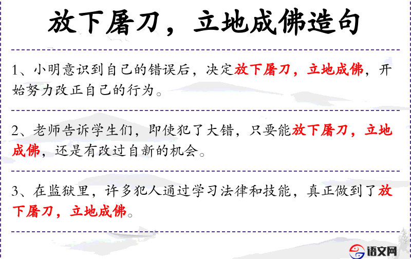 - 立地成佛:这个成语源自**,表示立即从恶行中解脱出来,达到一种精神上的觉悟状态。