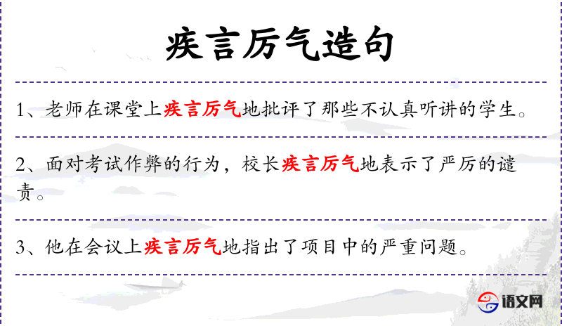 4. 【疾言厉气】 - 形容对人发怒说话时的神情。同“疾言厉色”。