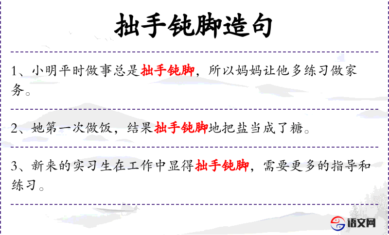- 拙手钝脚:形容做事不灵活、笨拙。