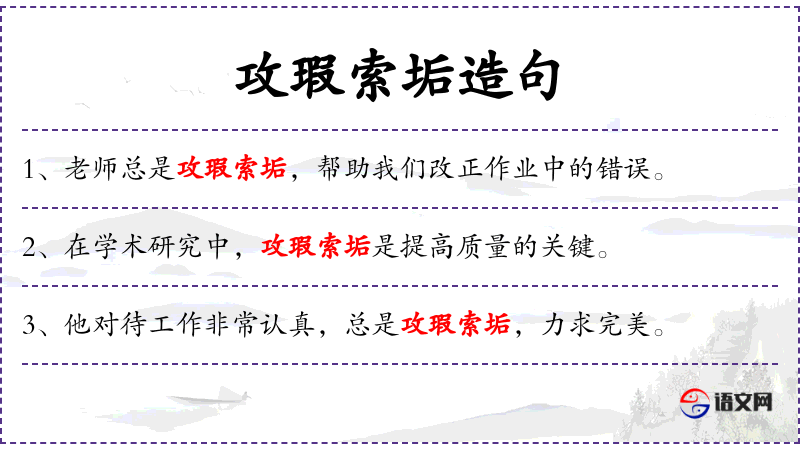 - 攻瑕索垢:成语,意为仔细寻找并纠正错误。