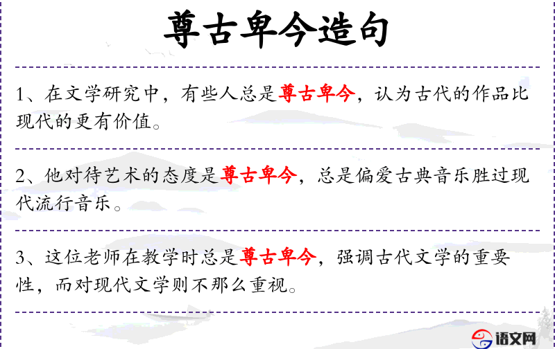 - 尊古卑今:尊重古代,轻视现代。这里的“尊”和“卑”是动词,表示对古代和现代的不同态度。