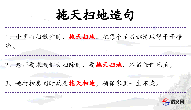 - 拖天扫地:可能是一个误用,正确的应该是“拖地扫地”,指清洁地面的行为。