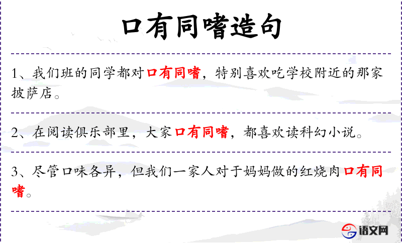 句子:“我们班的同学都对口有同嗜,特别喜欢吃学校附近的那家披萨店。”