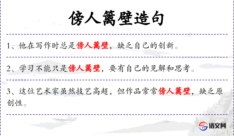 “傍人篱壁”这个成语源自传统文化,比喻依赖他人,没有自己的主见。这句话反映了文化中对独立性和创新精神的重视。