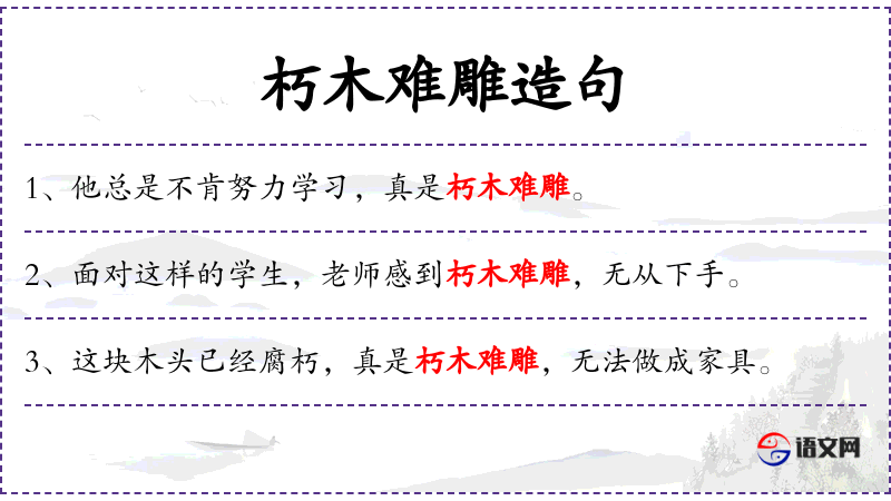 1. 【朽木难雕】 - 比喻人不可造就或事物和局势败坏而不可救药。同“朽木不可雕”。