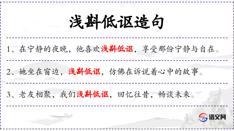 4. 【浅斟低讴】 - 斟:筛酒;讴:歌唱。斟着茶酒,低声歌唱。形容悠然自得、遣兴消闲的样子。