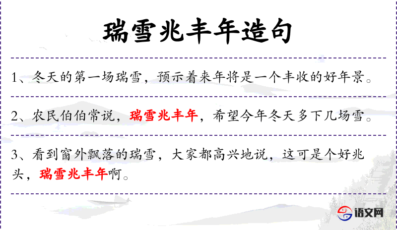 1. 【瑞雪兆丰年】 瑞:吉利的。适时的冬雪预示着来年是丰收之年。