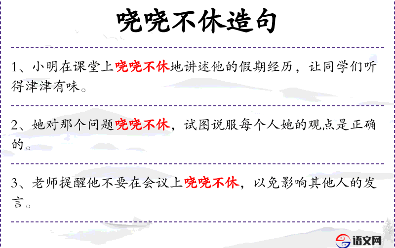 - 哓哓不休:形容说话啰嗦,不停地说。