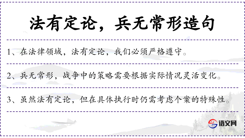 1. 【兵无常形】 - 用兵无一成不变的形势。指办事要因时、因地制宜,具体问题要用具体办法去解决。