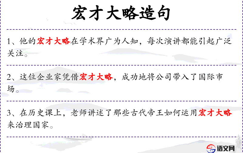 - 宏才大略:指某人具有卓越的才能和深远的谋略。