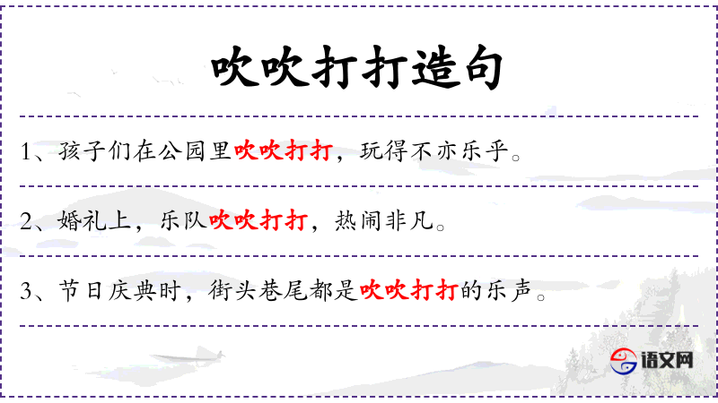 - 吹吹打打:形容孩子们在户外玩耍的声音和动作,状语。