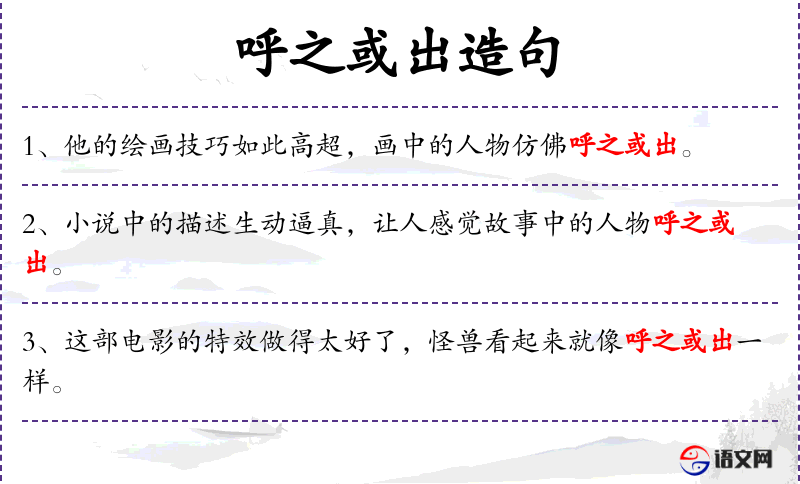 句子中的“呼之或出”是一个成语,形容形象或情感非常鲜明,好像随时都会显现出来。这个成语在**文化中常用于形容文学或艺术作品中的形象生动逼真。