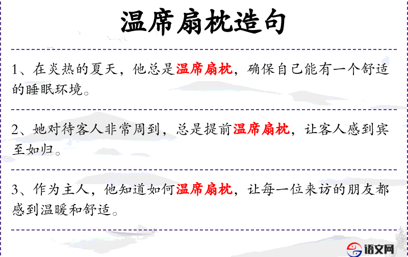 1. 【温席扇枕】 - 指侍奉父母无微不至。同“温枕扇席”。