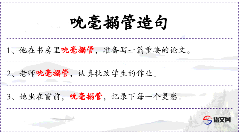 - 文化意义:“吮毫搦管”这个成语体现了*传统文化中对书写和学的重视。