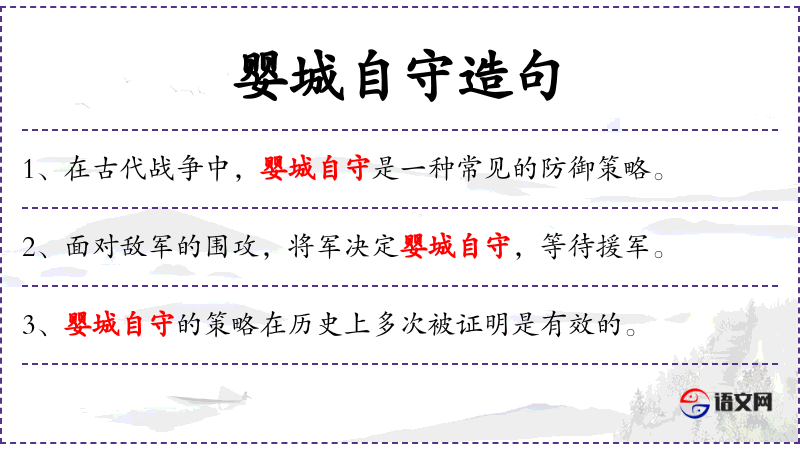 - 婴城自守:指在战争中坚守城池,不主动出击。