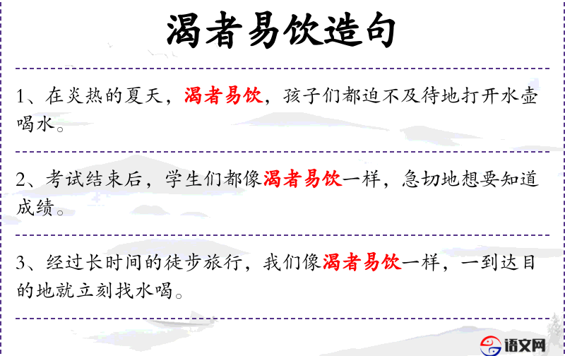 4. 【渴者易饮】 - 口渴的人喝什么都觉得甘甜。旧时比喻久经苛政而最知对德政感恩。
