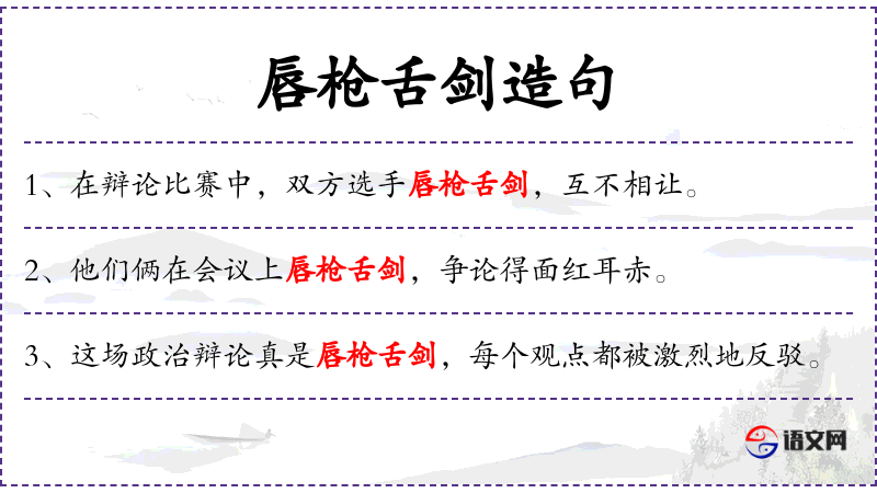 - 唇枪舌剑:成语,形容言辞激烈,争论不休。