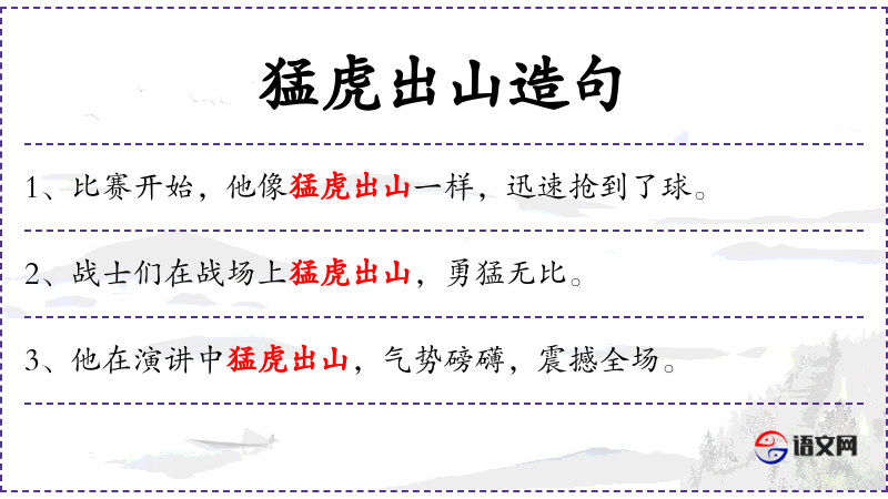 5. 【猛虎出山】 像凶猛的老虎出山一样。形容动作勇猛又快速。亦作“猛虎下山”、“猛虎离山”。