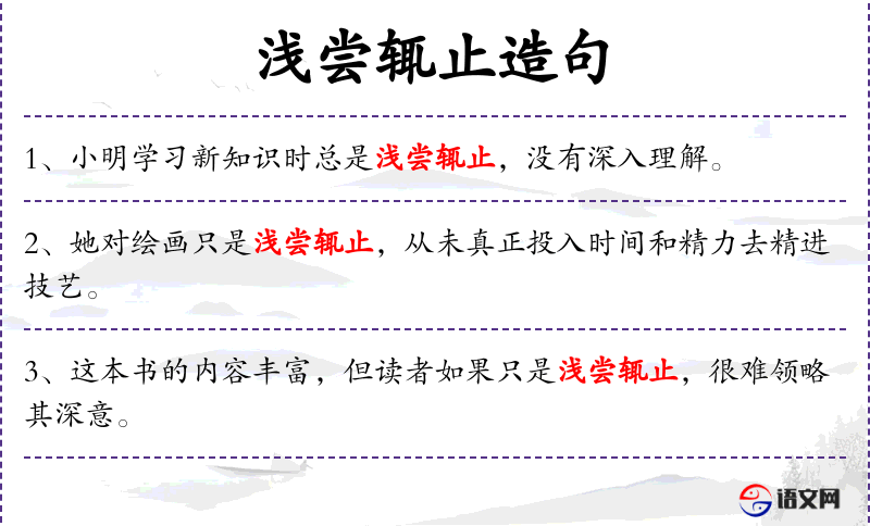 5. 【浅尝辄止】 辄:就。略微尝试一下就停下来。指不深入钻研。