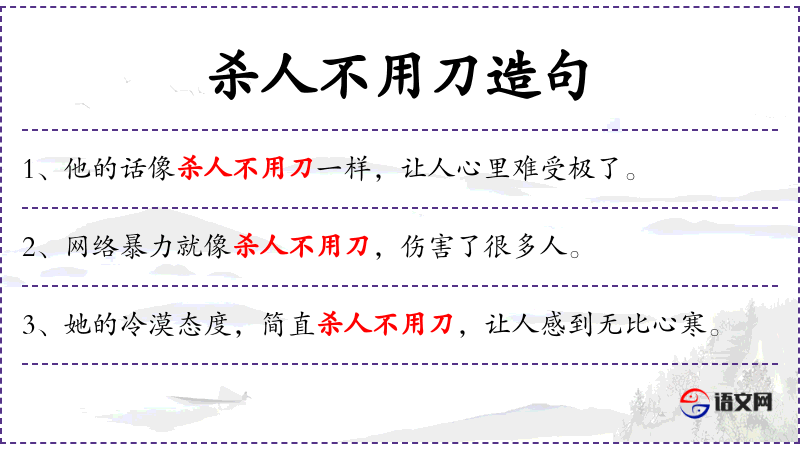 4. 【杀人不用刀】 - 比喻用嘴或笔陷害人于死地。