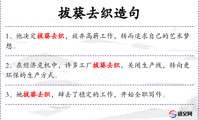 - 宾语:拔葵去织,放弃高薪工作,转而追求自己的艺术梦想