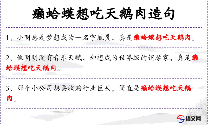 1. 【癞蛤蟆想吃天鹅肉】 比喻人没有自知之明,一心想谋取不可能到手的东西。