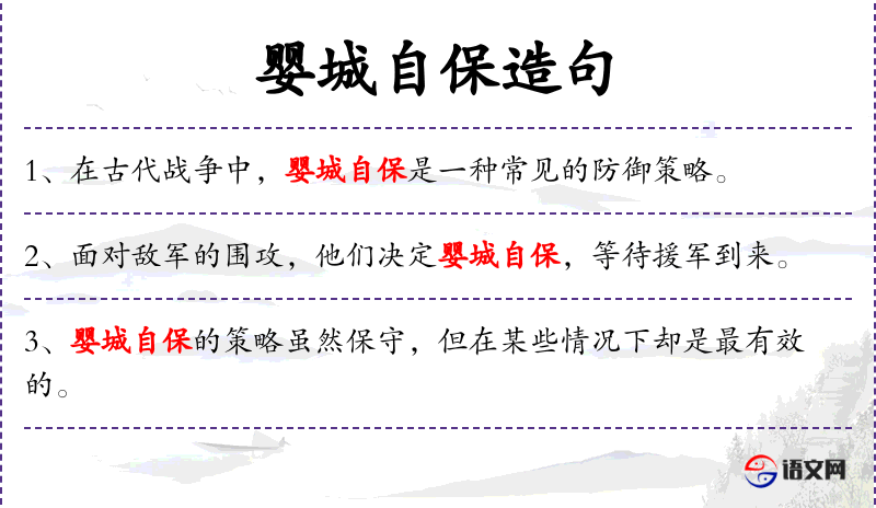 - 婴城自保:这个成语源自古代战争策略,强调在敌军围攻下坚守城池的重要性。