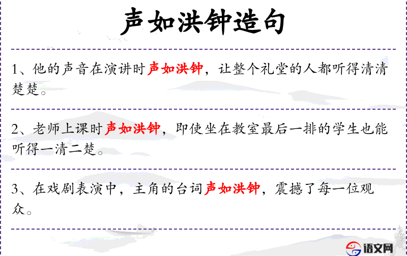 句子中的“声如洪钟”是一个成语,源自古代对声音的比喻,常用来形容声音宏亮有力。这个成语反映了文化中对声音美学的追求和评价标准。