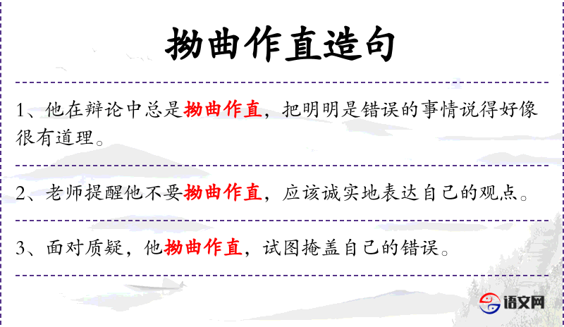 - 拗曲作直:twist the facts to make them appear correct,表示歪曲事实以使其看起来正确。