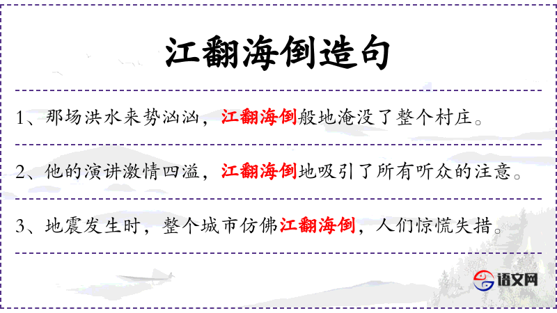 4. 【江翻海倒】 - 犹江翻海沸。形容水势浩大。多用以比喻力量或声势壮大。
